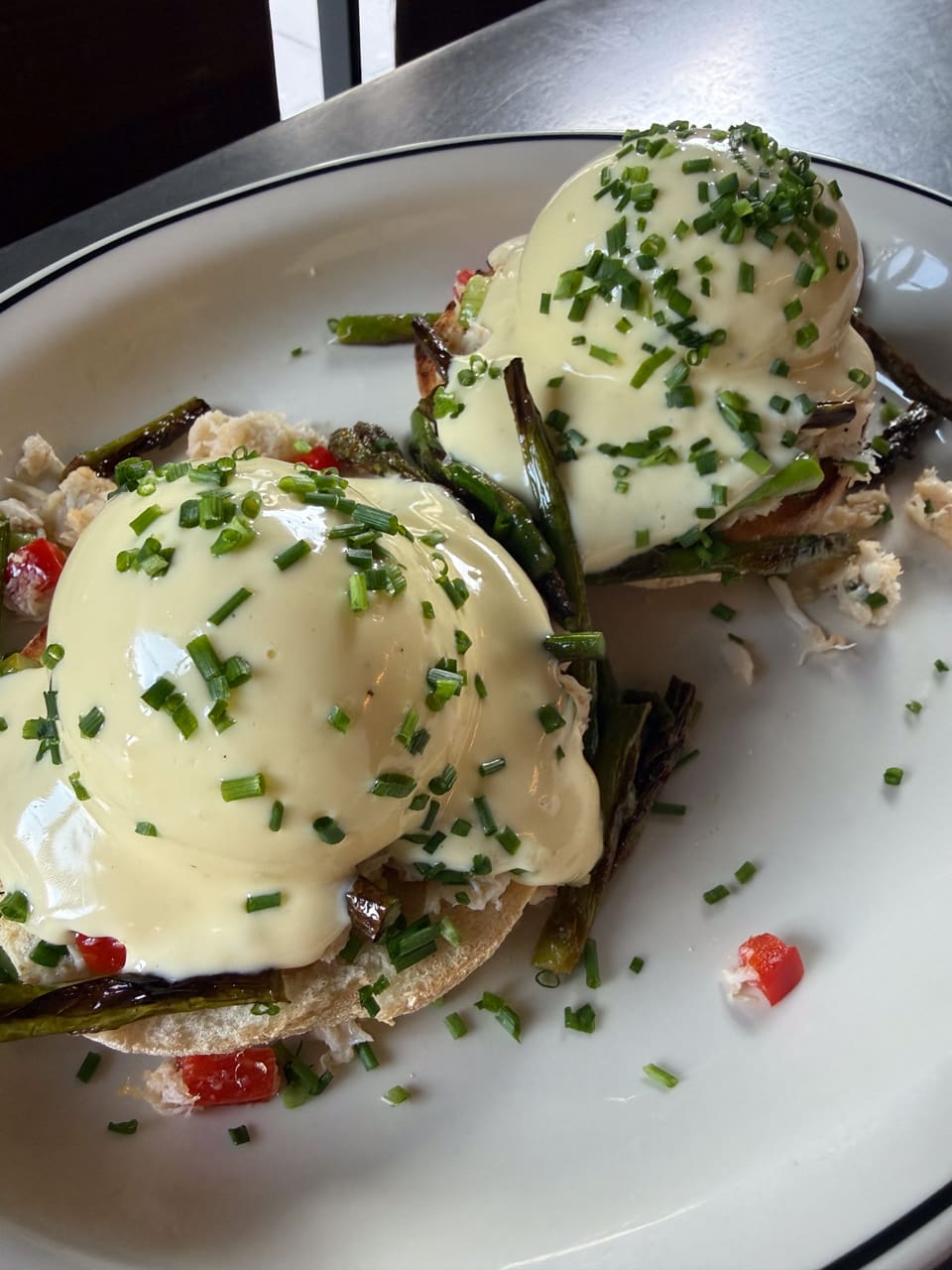 5-minute egg*, crab salad, roasted asparagus, hollandaise, chives, English muffin