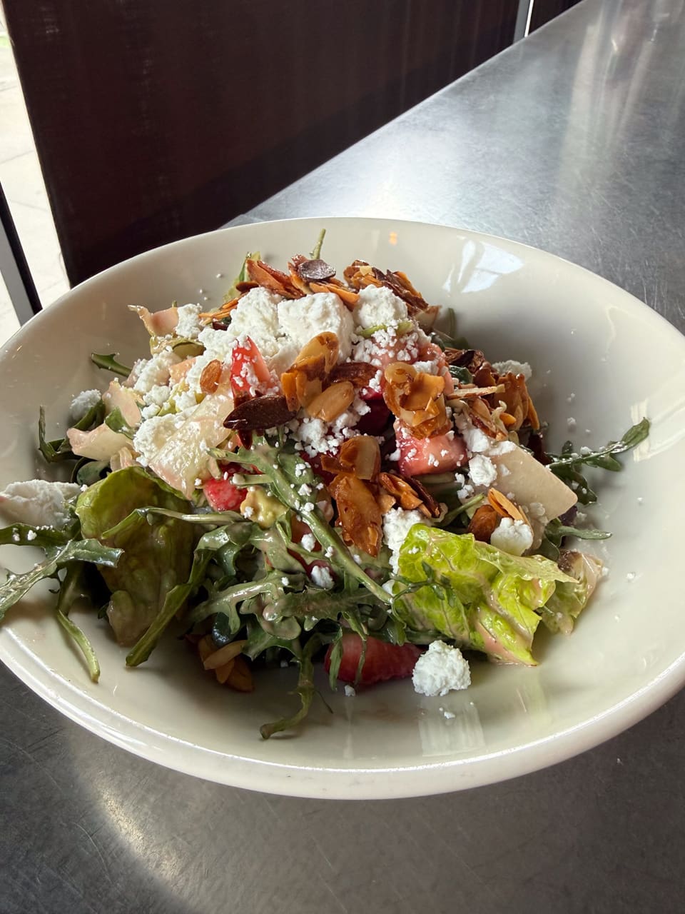 Arugula, romaine, strawberries, avocado, strawberry vinaigrette, candied almonds; add diced chicken $7